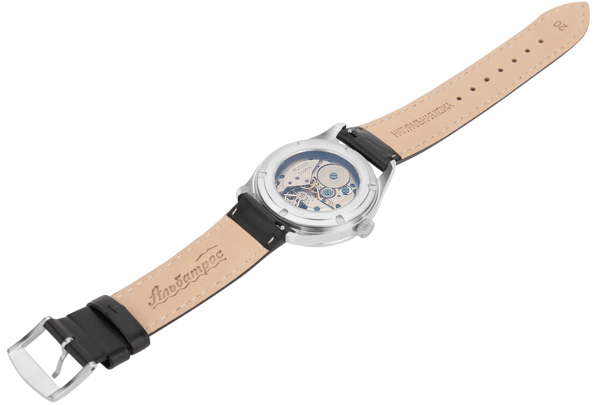 Часы мужские «Альбатрос» с ручным заводом (2409), механизм улучшенной отделки винты синие. Кольцо крепления стальное. Корпус выполнен из нержавеющей стали (316), браширован (не видно следы использование - царапины), грань ушков полировка. Размер корпуса: диаметр – 38 мм, от ушка к ушку 45 мм, толщина 12,2 мм. Видимая часть циферблата 31,5 мм Головка с логотипом луковичной формы. Задняя крышка винтовая, прозрачная (сапфир) Индивидуальный номер 001/200 (в данном цвете с данным механизмом выпущено 50 штук). Водозащита 5 атм. (мытьё рук, кратковременное воздействие водной среды). Ремень кожа в цвет циферблата, ширина 20х18 мм, пряжка с логотипом, брашировка, тиснение логотипа на внутренней стороне, система быстрой замены.. Длина ремня 115х75мм.
