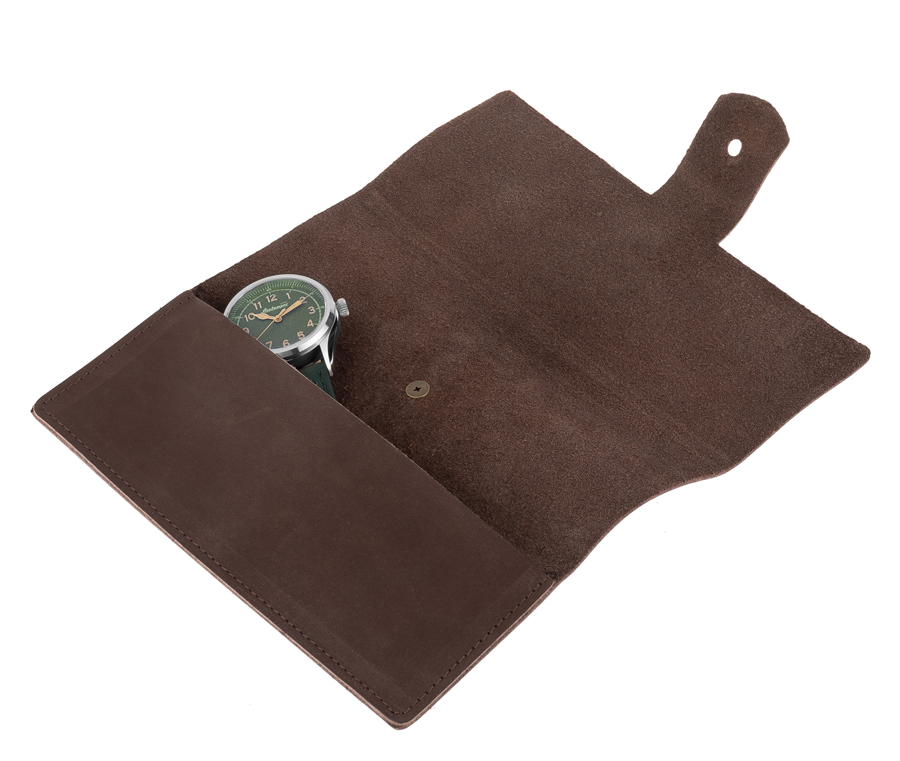Стекло сапфировое немного выпуклое с антибликом. Циферблат имеет песчаную фактуру зеленого цвета (Pantone 7534U), метки 3D типа люминофор Super Luminova BGW9. Стрелки IPS, брашировка. покрыты люминофором Super Luminova BGW9. Часы комплектуются тревел-кейсом из кожи лого.
