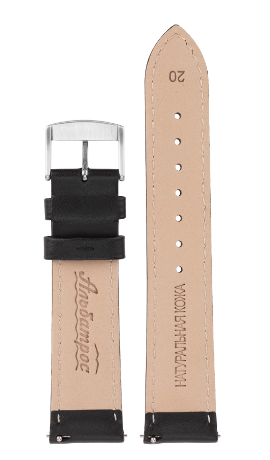 Ремень чёрный (кожа) для модели часов "Альбатрос" 3855M, ширина 20*18мм, Длина ремня 115х75мм. толщина у часов 4 мм к пряжке 2,5 мм, пряжка сталь с лого, на обратной стороне ремня - тиснение лого.