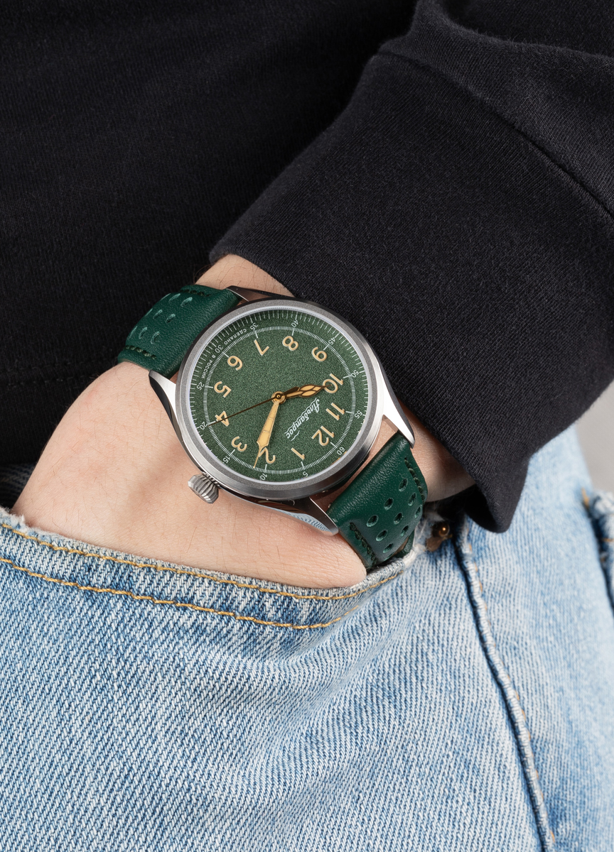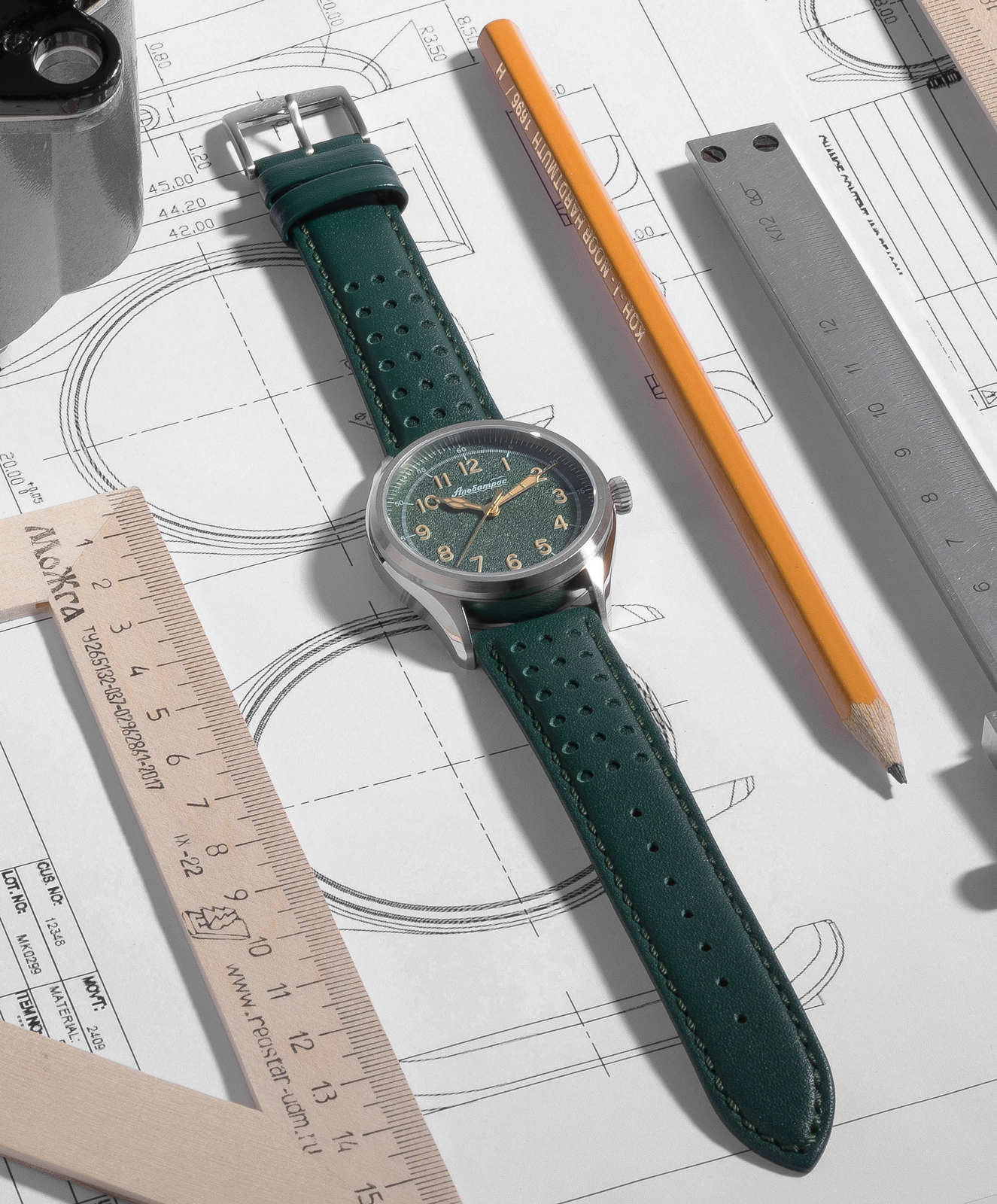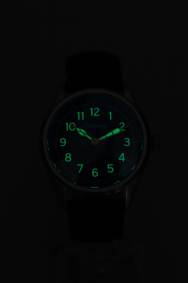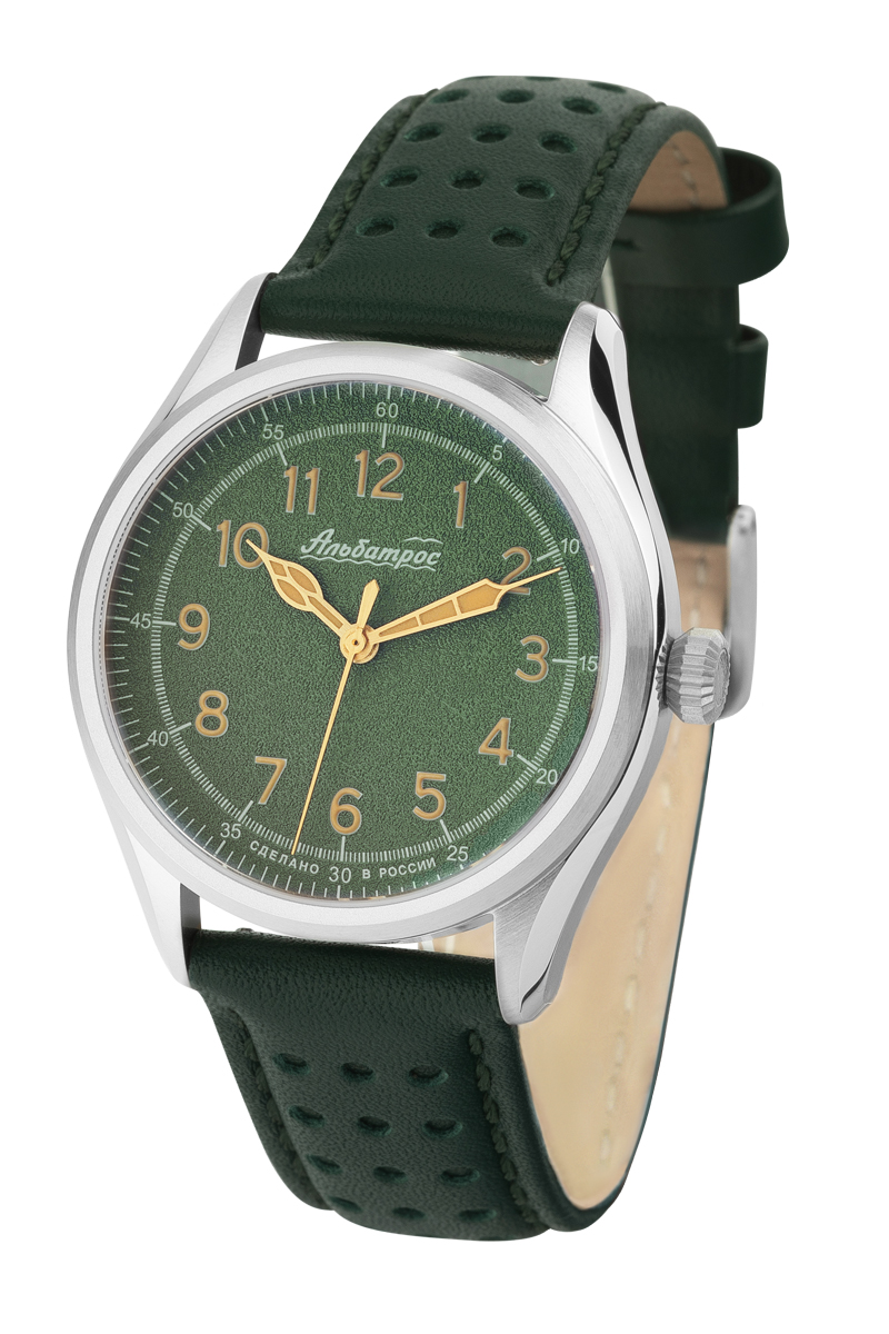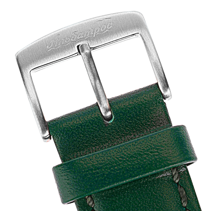 Часы мужские «Альбатрос» (2415), АПЗ. Кольцо крепления механизма стальное. Корпус выполнен из нержавеющей стали (316), браширован (не видно следы использования - царапины), грань ушков полировка. Размер корпуса: диаметр – 38 мм, от ушка к ушку 45 мм, толщина 13,2 мм. Видимая часть циферблата 31,5 мм Головка с логотипом луковичной формы. Задняя крышка винтовая, нержавеющая сталь без стекла с лого. Индивидуальный номер 001/300 (в данном цвете с данным механизмом выпущено 100 штук). Водозащита 5 атм. (мытьё рук, кратковременное воздействие водной среды). Ремень кожа в цвет циферблата, ширина 20х18 мм, пряжка с логотипом, брашировка, тиснение логотипа на внутренней стороне, система быстрой замены. Длина ремня 115х75мм.