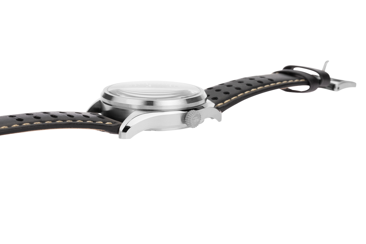 Стекло сапфировое немного выпуклое с антибликом. Циферблат имеет песчаную фактуру зеленого цвета (Pantone 7534U), метки 3D типа люминофор Super Luminova BGW9. Стрелки IPS, брашировка. покрыты люминофором Super Luminova BGW9. Часы комплектуются тревел-кейсом из кожи лого.
