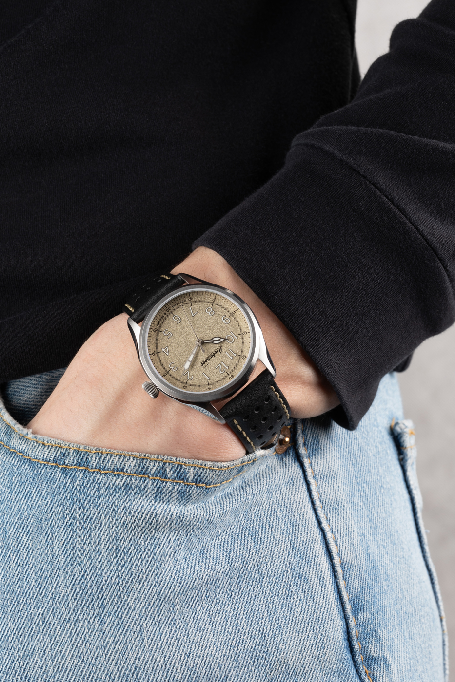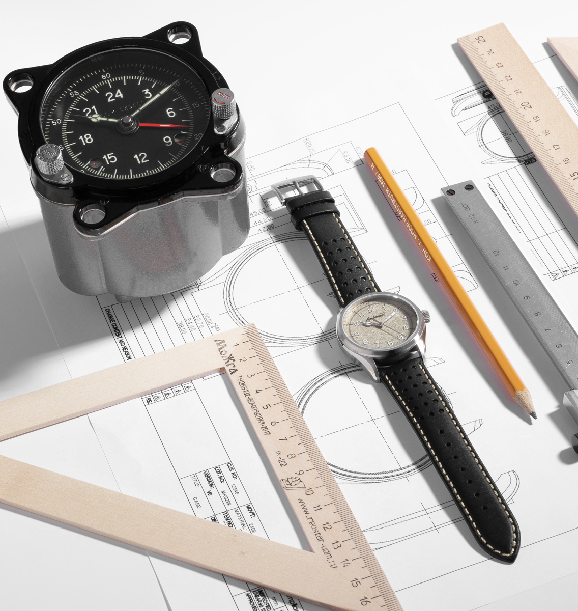 Дизайнерское решение было продиктовано Авиационным часовым прибором 55М использовавашегося в армейской авиации. Это 2 исполнение в меньше размере.