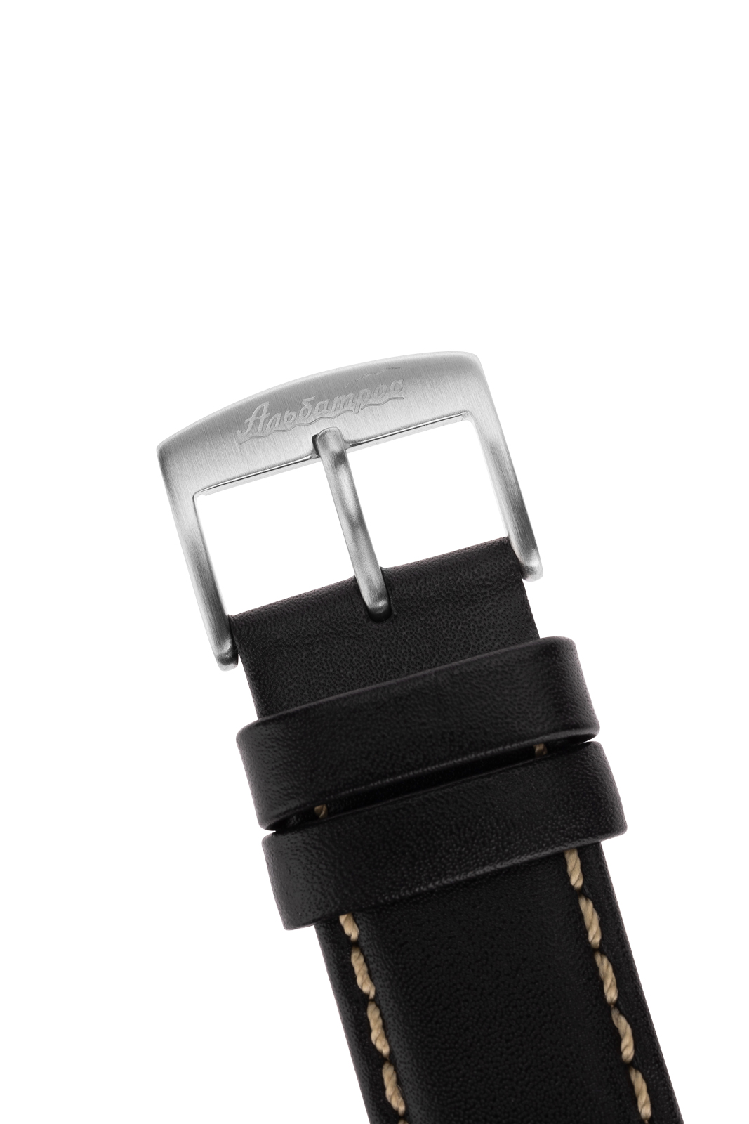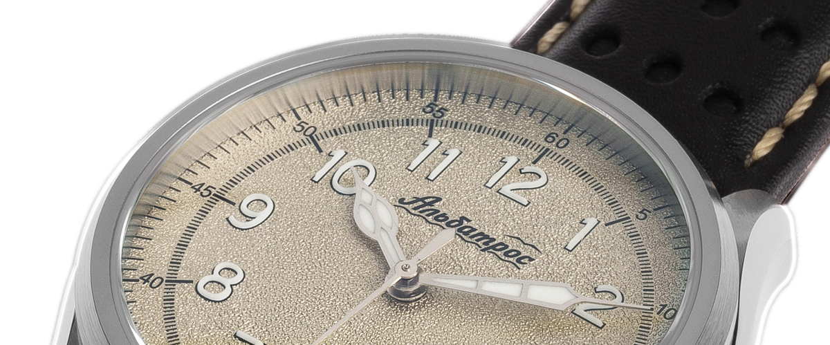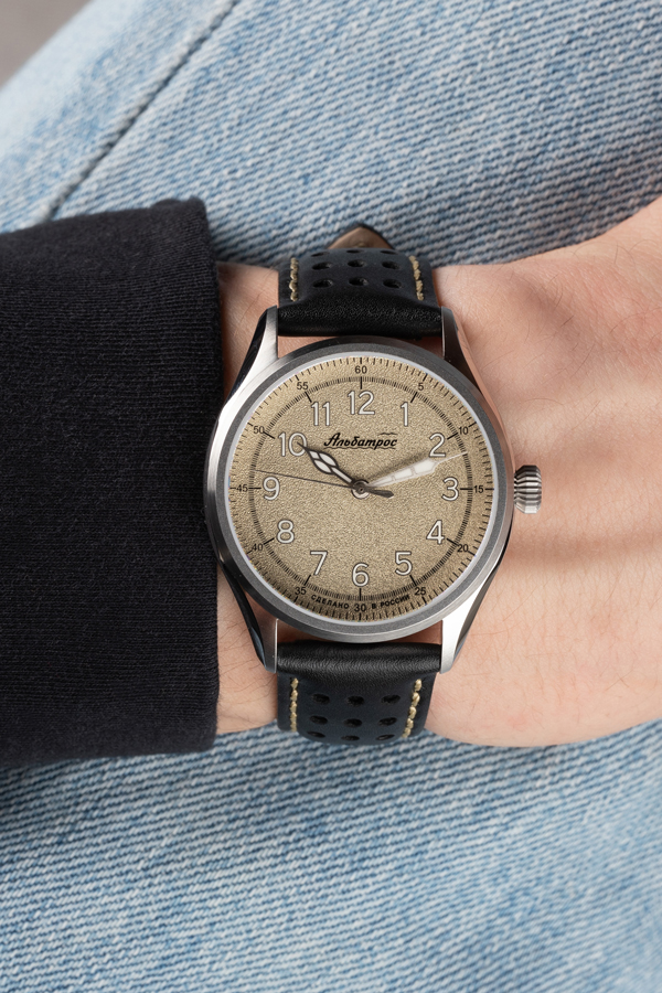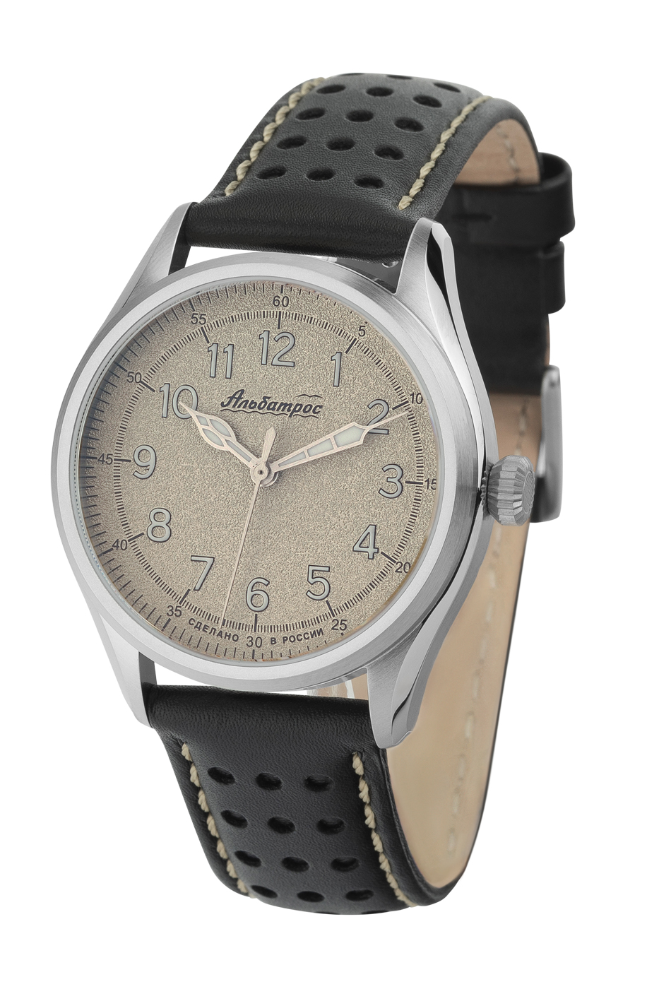 Часы мужские «Альбатрос» с ручным заводом (2409), механизм улучшенной отделки винты синие. Кольцо крепления стальное. Корпус выполнен из нержавеющей стали (316), браширован (не видно следы использование - царапины), грань ушков полировка. Размер корпуса: диаметр – 38 мм, от ушка к ушку 45 мм, толщина 12,2 мм. Видимая часть циферблата 31,5 мм Головка с логотипом луковичной формы. Задняя крышка винтовая, прозрачная (сапфир) Индивидуальный номер 001/200 (в данном цвете с данным механизмом выпущено 50 штук). Водозащита 5 атм. (мытьё рук, кратковременное воздействие водной среды). Ремень кожа в цвет циферблата, ширина 20х18 мм, пряжка с логотипом, брашировка, тиснение логотипа на внутренней стороне, система быстрой замены.. Длина ремня 115х75мм.