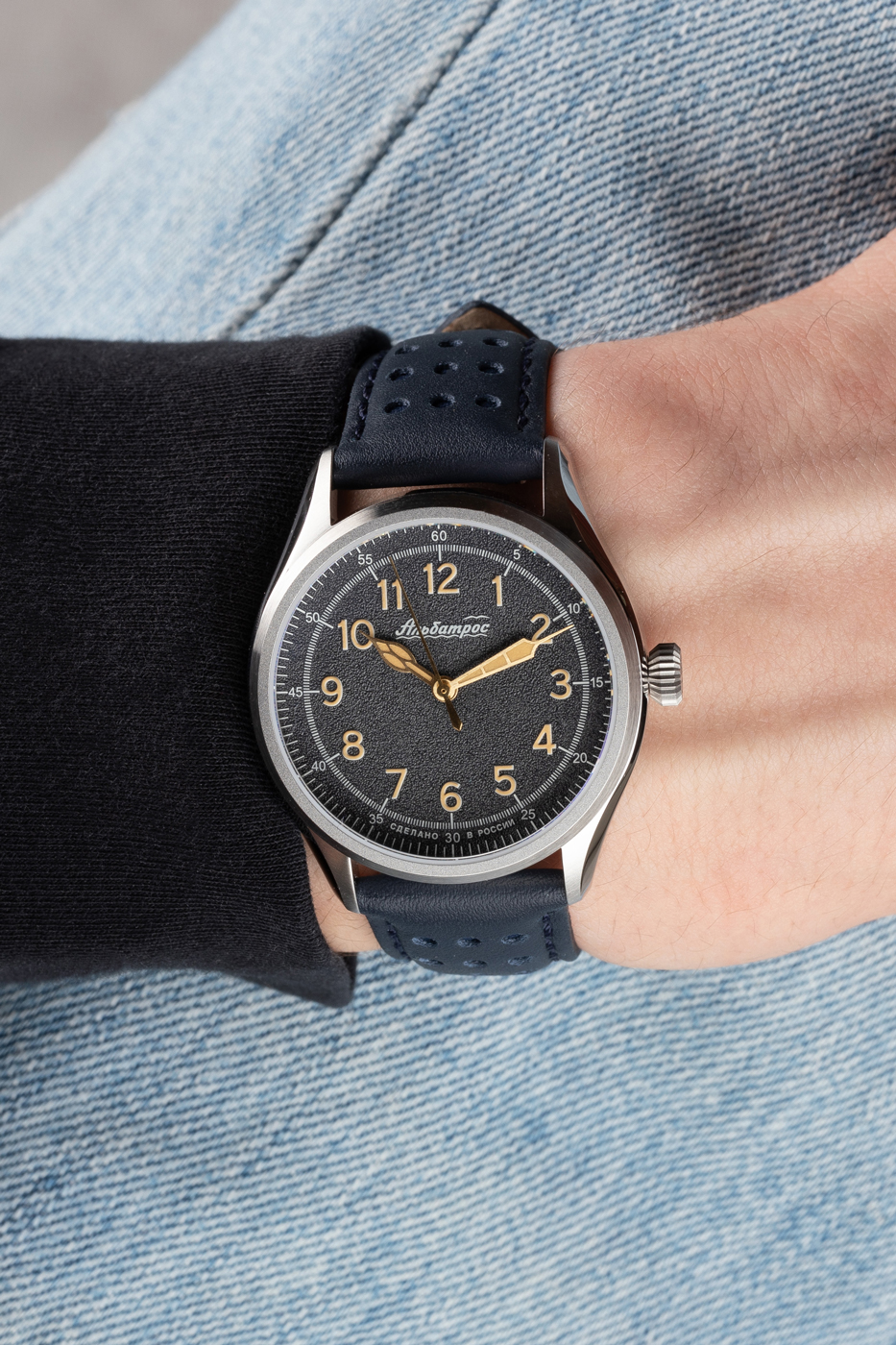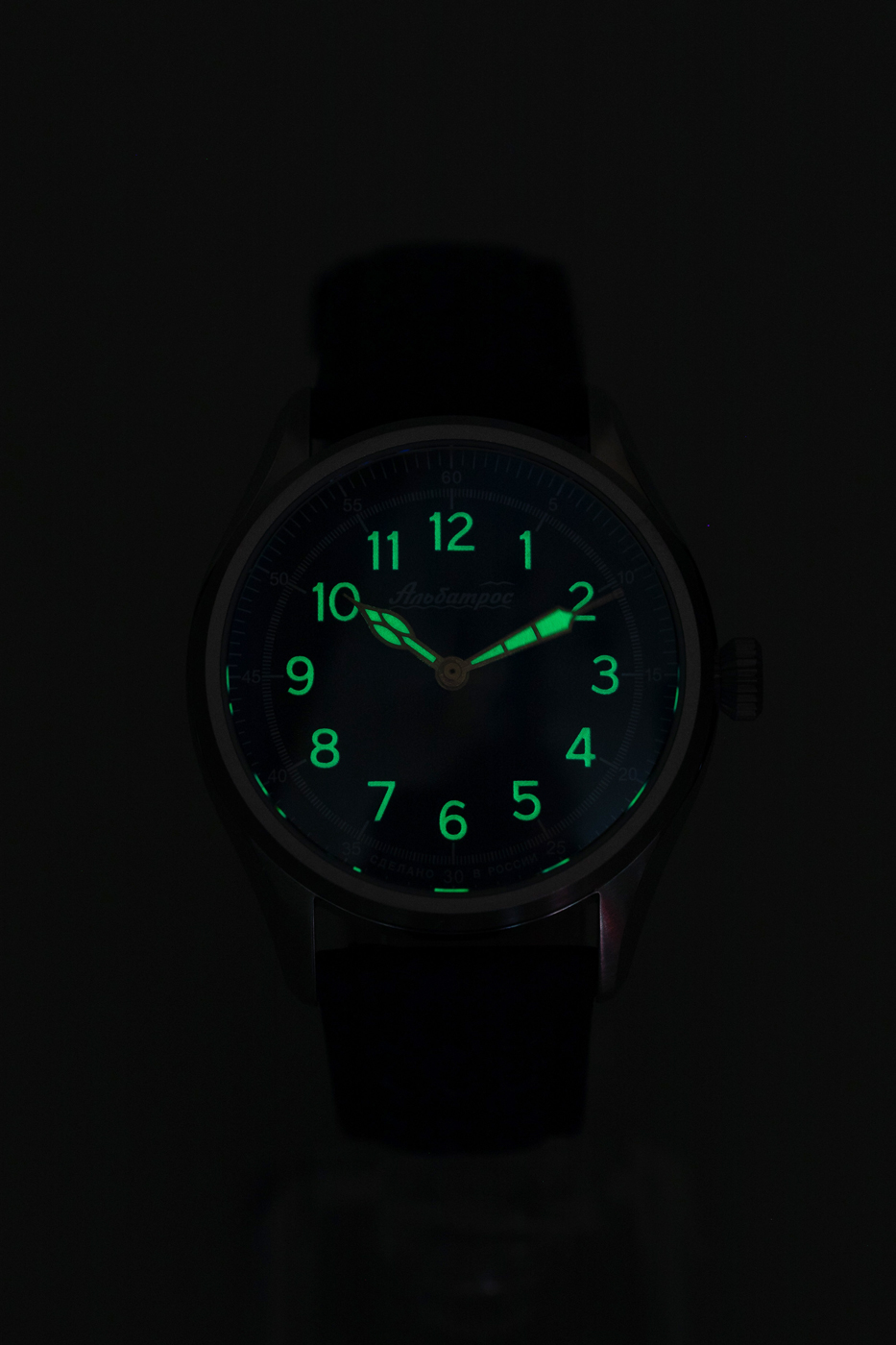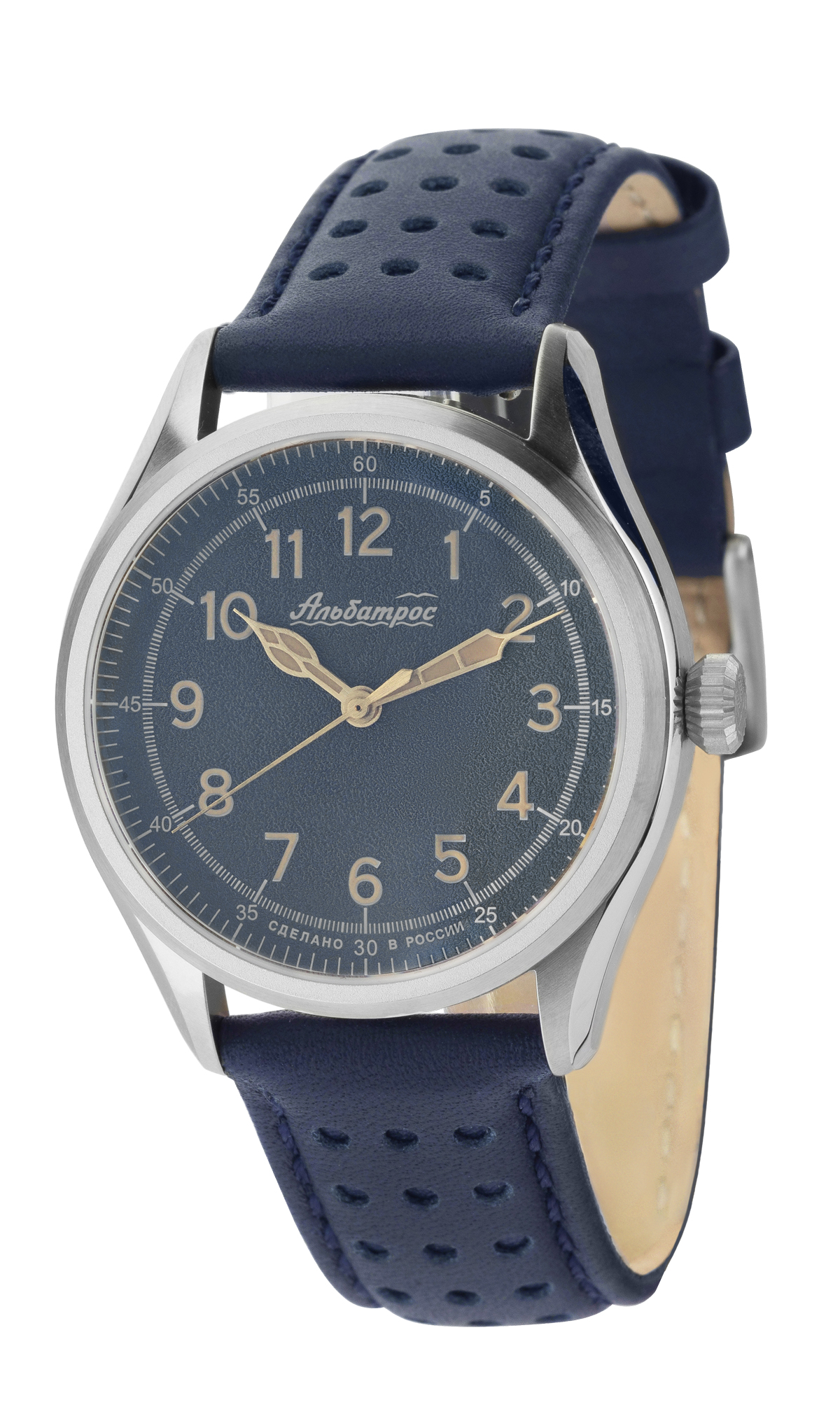 Часы мужские «Альбатрос» с ручным заводом (2409), механизм улучшенной отделки винты позолота. Кольцо крепления стальное. Корпус выполнен из нержавеющей стали (316), браширован (не видно следы использование - царапины), грань ушков полировка. Размер корпуса: диаметр – 38 мм, от ушка к ушку 45 мм, толщина 12,2 мм. Видимая часть циферблата 31,5 мм Головка с логотипом луковичной формы. Задняя крышка винтовая, прозрачная (сапфир) Индивидуальный номер 001/200 (в данном цвете с данным механизмом выпущено 100 штук). Водозащита 5 атм. (мытьё рук, кратковременное воздействие водной среды). Ремень кожа в цвет циферблата, ширина 20х18 мм, пряжка с логотипом, брашировка, тиснение логотипа на внутренней стороне, система быстрой замены.. Длина ремня 115х75мм.
