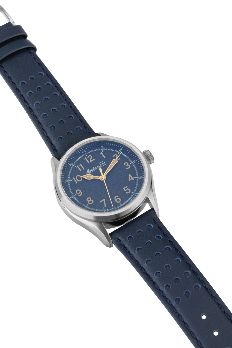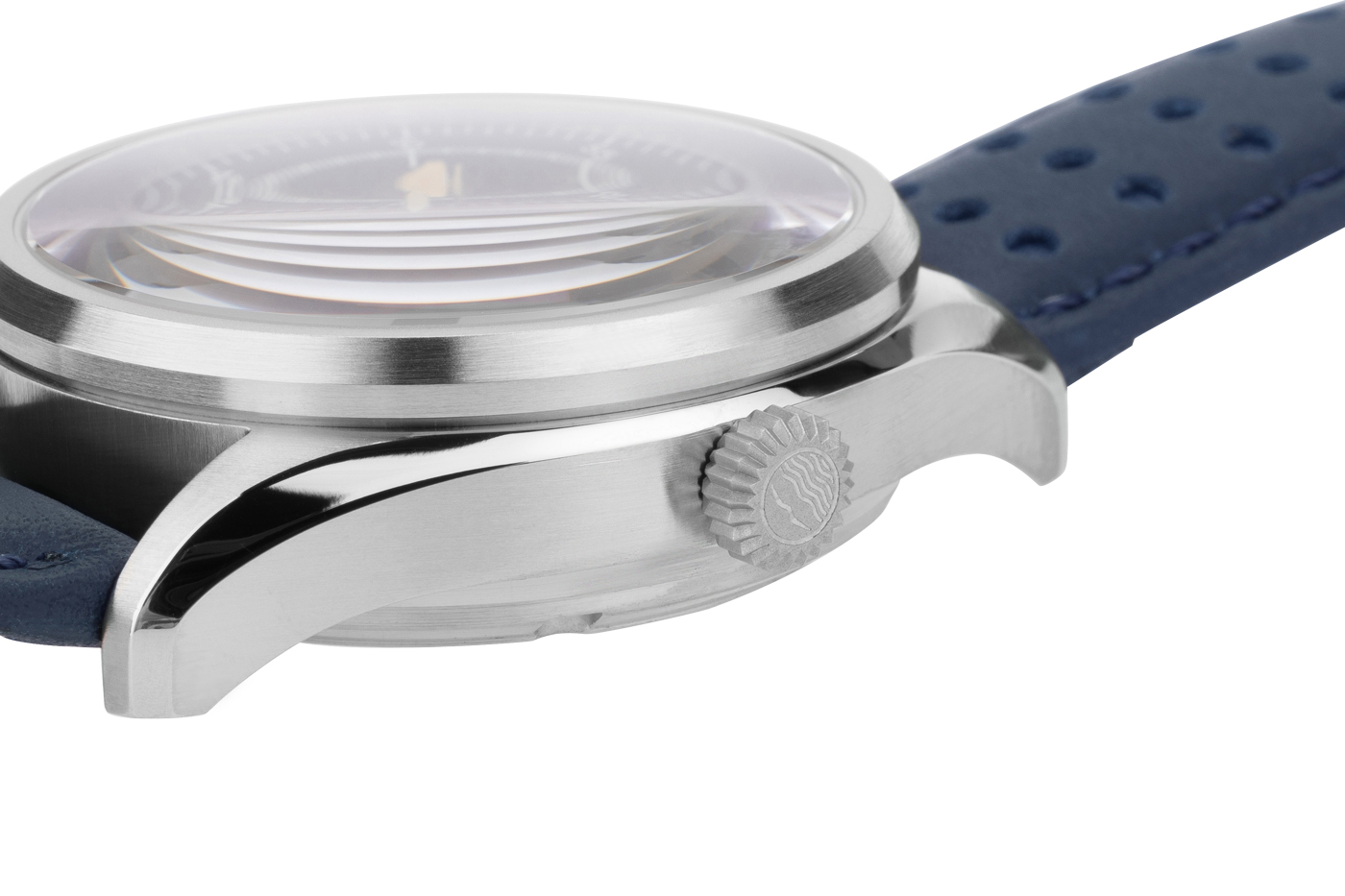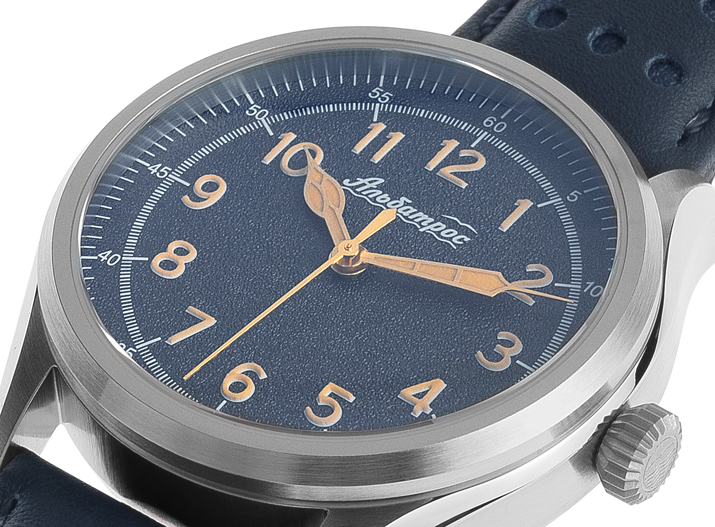 Стекло сапфировое немного выпуклое с антибликом. Циферблат имеет песчаную фактуру темно-синего цвета (Pantone303U), метки 3D типа люминофор Super Luminova Old Radium. Стрелки IPG, брашировка. покрыты люминофором Super Luminova Old Radium. Часы комплектуются тревел-кейсом из кожи лого.
