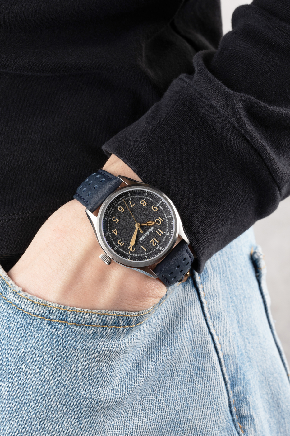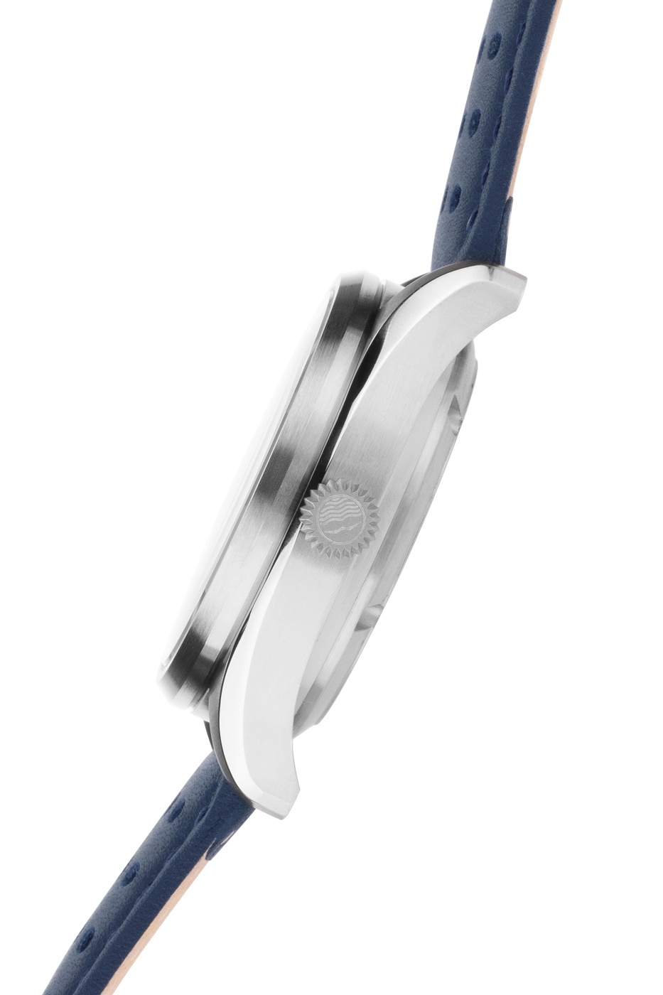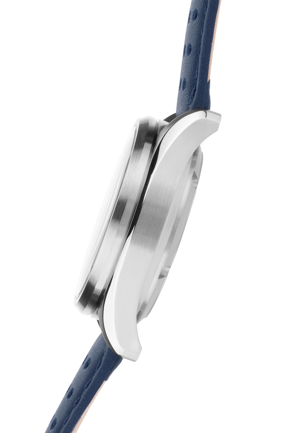 Стекло сапфировое немного выпуклое с антибликом. Циферблат имеет песчаную фактуру темно-синего цвета (Pantone303U), метки 3D типа люминофор Super Luminova Old Radium. Стрелки IPG, брашировка. покрыты люминофором Super Luminova Old Radium. Часы комплектуются тревел-кейсом из кожи лого.