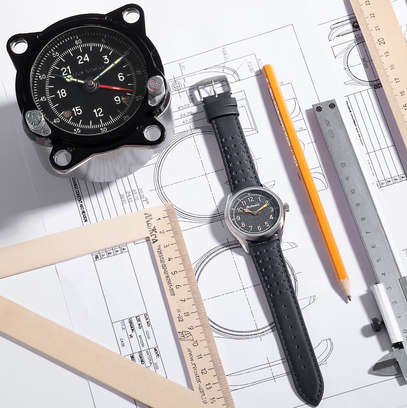 Дизайнерское решение было продиктовано Авиационным часовым прибором 55М использовавашегося в армейской авиации. Это 2 исполнение в меньше размере.