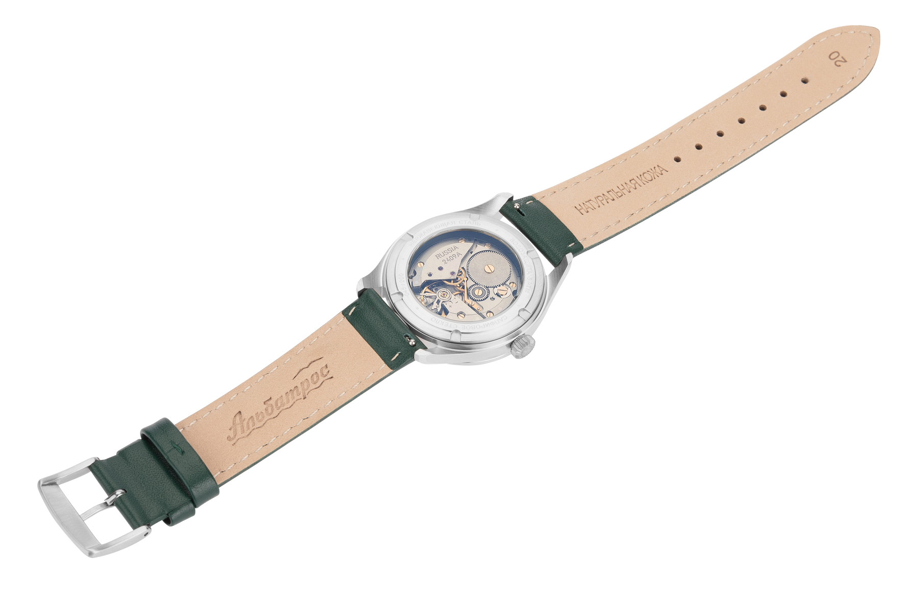Часы мужские «Альбатрос» с ручным заводом (2409), механизм улучшенной отделки винты позолота. Кольцо крепления стальное. Корпус выполнен из нержавеющей стали (316), браширован (не видно следы использования - царапины), грань ушков полировка. Размер корпуса: диаметр – 38 мм, от ушка к ушку 45 мм, толщина 12,2 мм. Видимая часть циферблата 31,5 мм Головка с логотипом луковичной формы. Задняя крышка винтовая, прозрачная (сапфир) Индивидуальный номер 001/200 (в данном цвете с данным механизмом выпущено 50 штук). Водозащита 5 атм. (мытьё рук, кратковременное воздействие водной среды). Ремень кожа в цвет циферблата, ширина 20х18 мм, пряжка с логотипом, брашировка, тиснение логотипа на внутренней стороне, система быстрой замены.. Длина ремня 115х75мм.