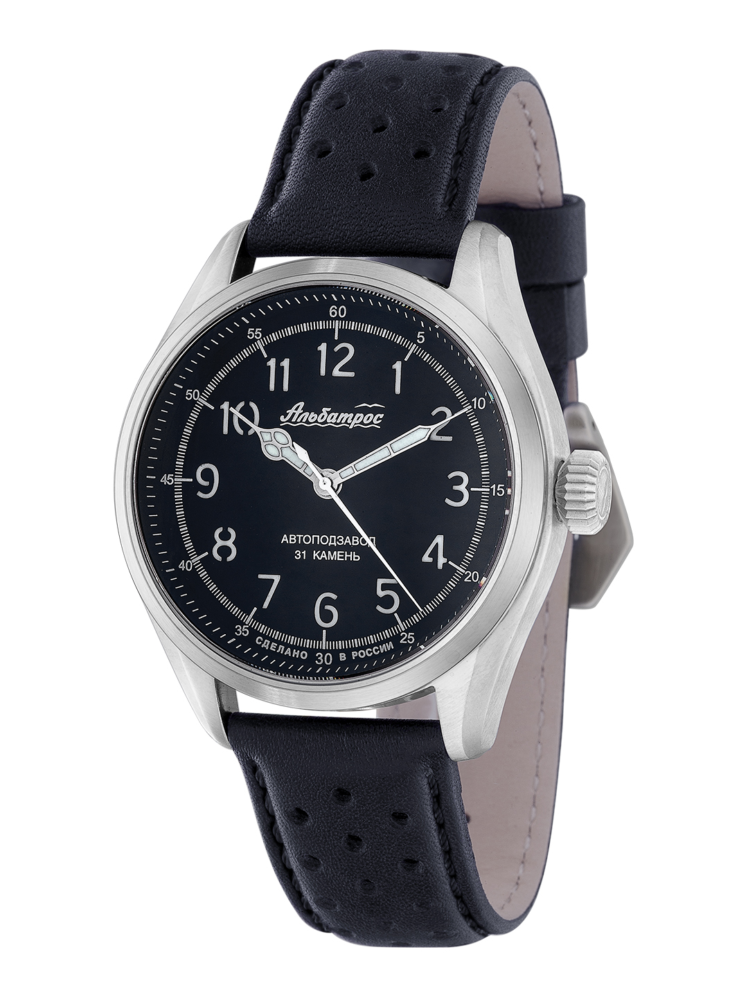 Часы мужские «Альбатрос» с автоподзаводом (Восток 2415), ротор с логотипом, механизм улучшенной отделки. Кольцо крепления стальное. Корпус выполнен из нержавеющей стали (316), браширован (не видно следы использование -царапины). Размер корпуса: диаметр – 44 мм, от ушка к ушку 51 мм, толщина 13,5 мм. Головка винтовая с логотипом луковичной формы. Задняя крышка винтовая, прозрачная (стекло -сапфир), уникальный номер (всего 75 шт). Водозащита 10 атм. Ремень кожа, ширина 22 мм, пряжка с логотипом, тиснение логотипа на внутренней стороне. Длина ремня 120х80мм (XXL)