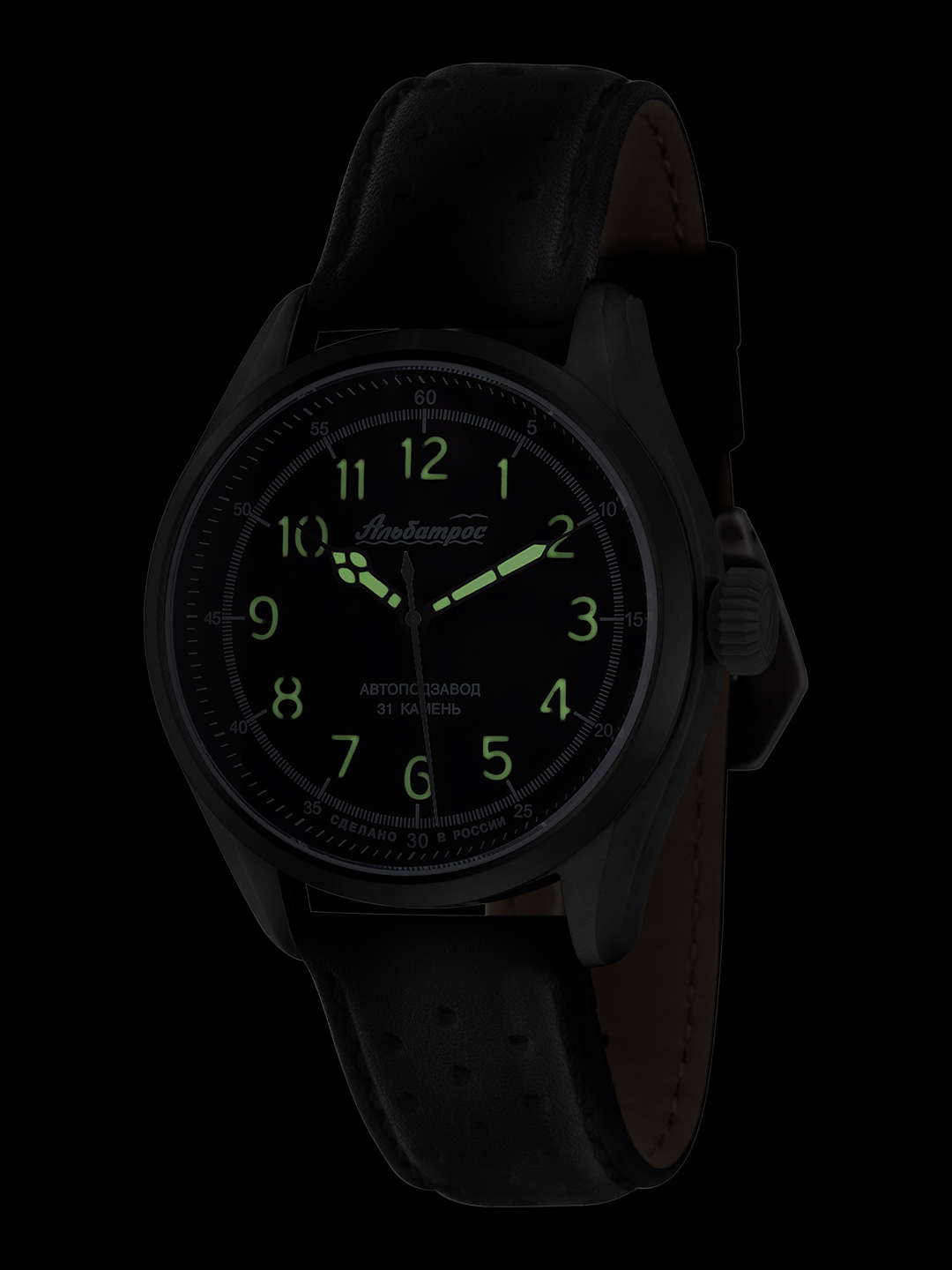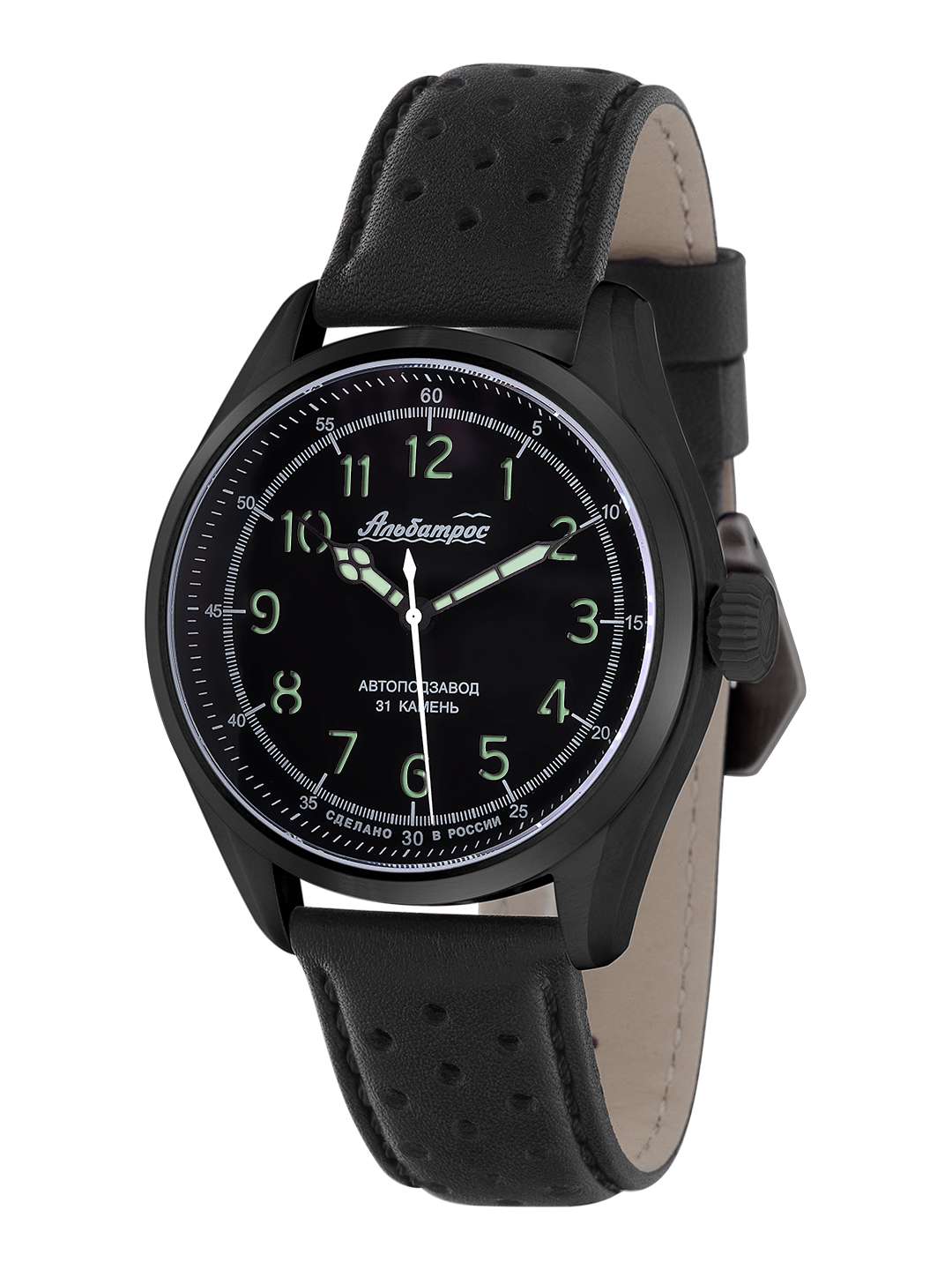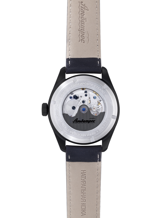 Часы мужские «Альбатрос» с автоподзаводом (Восток 2415), ротор с логотипом, механизм улучшенной отделки. Кольцо крепления стальное. Корпус выполнен из нержавеющей стали (316) с PVD покрытием, браширован (не видно следы использование -царапины). Размер корпуса: диаметр – 44 мм, от ушка к ушку 51 мм, толщина 13,5 мм. Головка винтовая с логотипом луковичной формы. Задняя крышка винтовая, прозрачная (сапфир). Водозащита 10 атм. Ремень кожа, ширина 22 мм, пряжка с логотипом, тиснение логотипа на внутренней стороне. Длина ремня 120х80мм (XXL)
