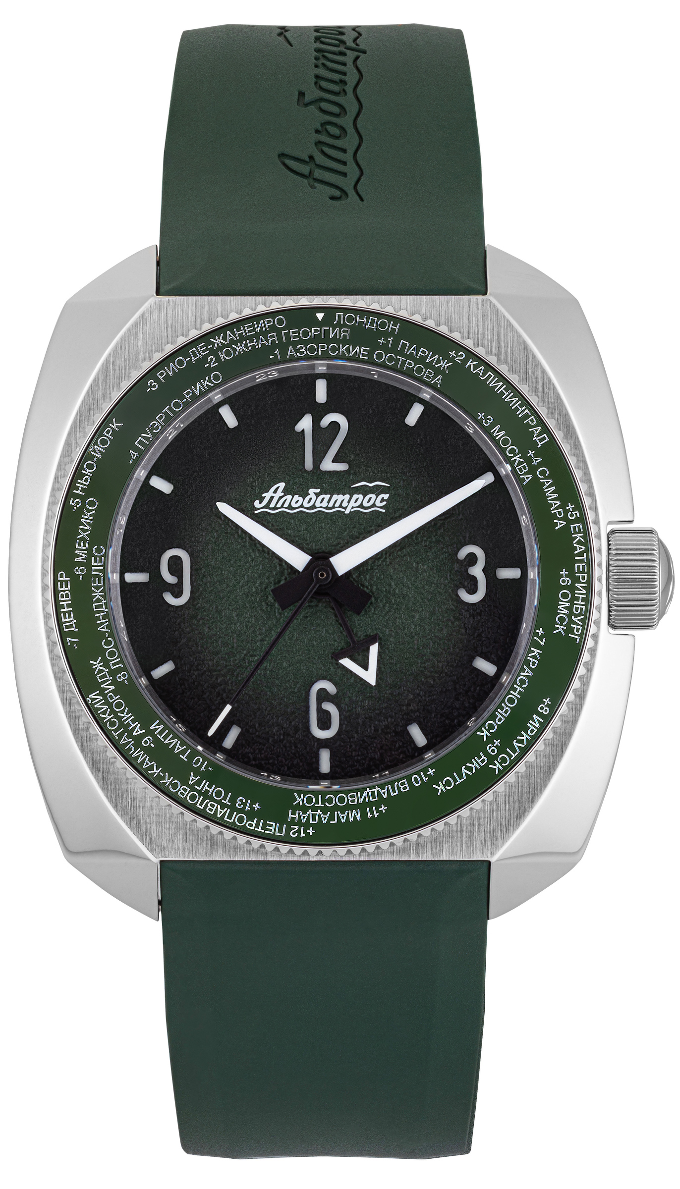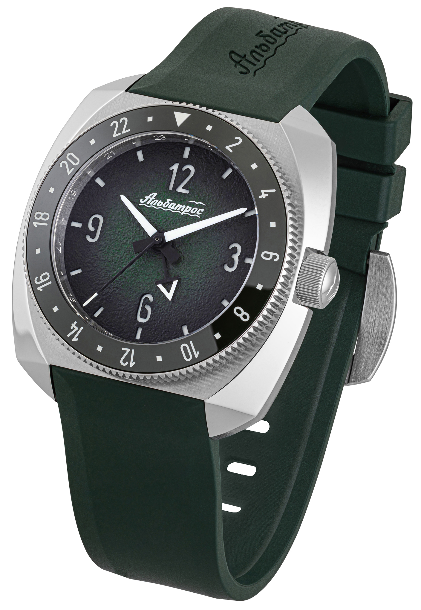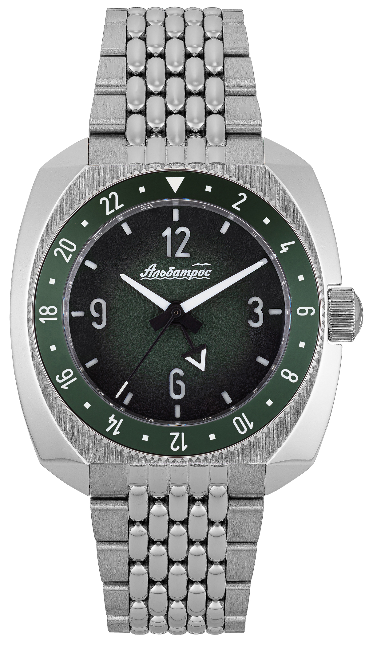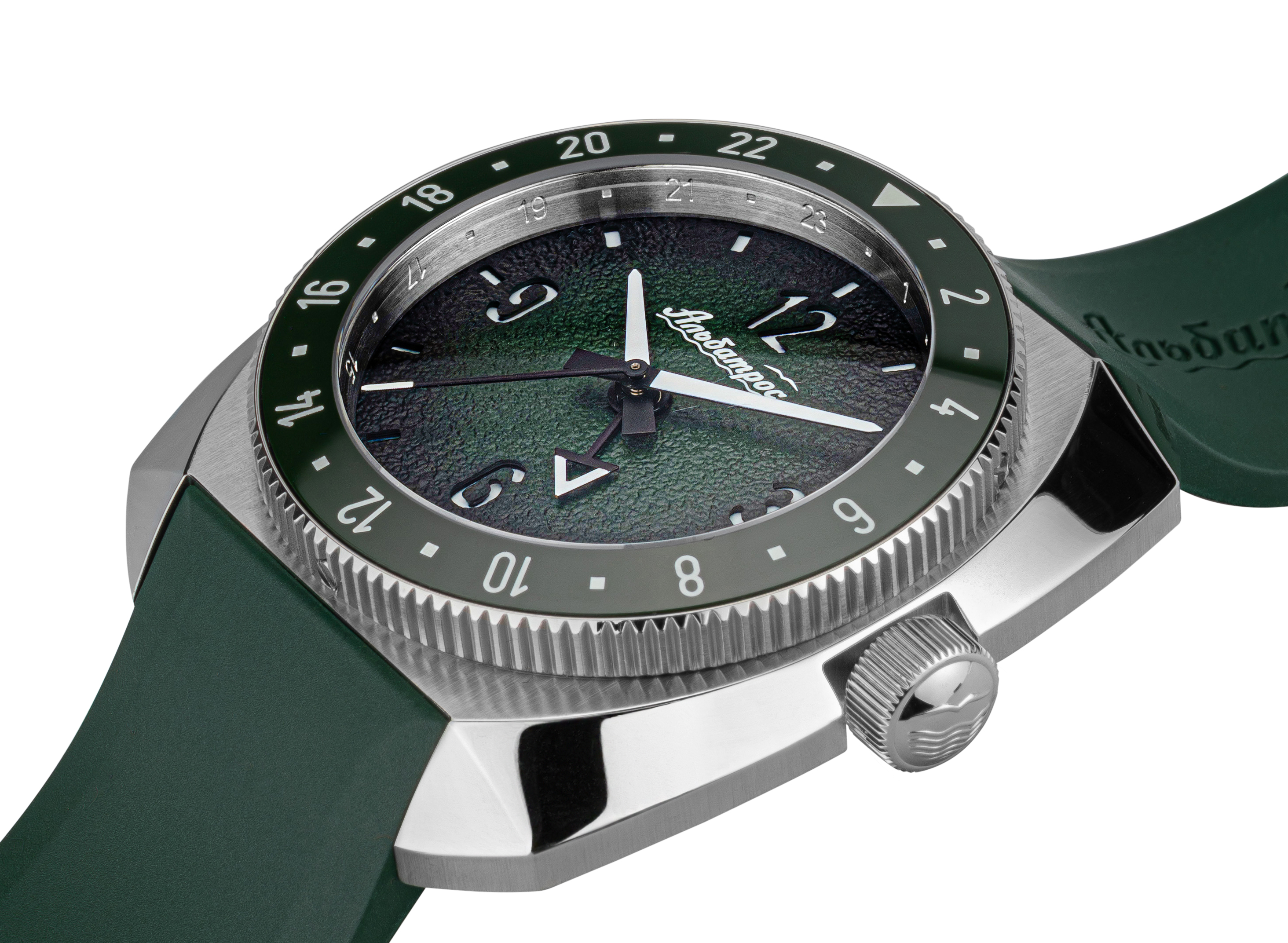 Гранёный корпус: нестандартной подушкообразной формой, многогранные фасеты создают динамичные переходы: от полированных граней к матовым поверхностям направленной брашировки, обеспечивая эргономику, идеальное расположения на любой руке, световые блики и визуальную глубину. Задняя крышка винтовая, литая, с рельефным полированным альбатросом - символом бренда, воплощающим три стихии (вода, земля, воздух), птица парит одновременно в трех стихиях. Вращающийся безель на 120 кликах с керамической вставкой поддерживает отсчёт двойного времени, в 24-часовой формате и безель с городами мира (в комплекте). Безель в 24 формате обладает люминофорным покрытием Super Luminova (BGW9 и Old Radium в зависимости от модели). Массивная заводная головка с логотипом – винтовой фиксации. Стекло сапфировое с антибликом. Полноценная водозащита 200 метров.