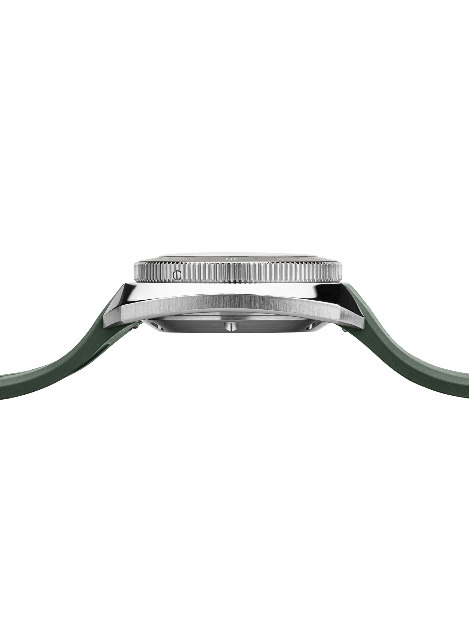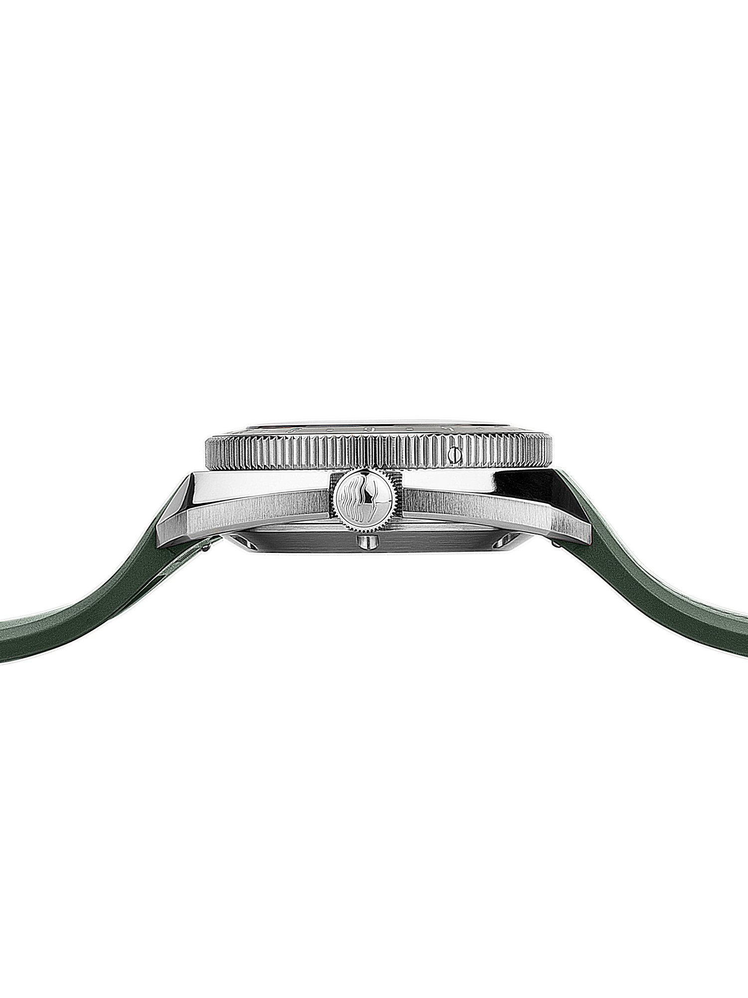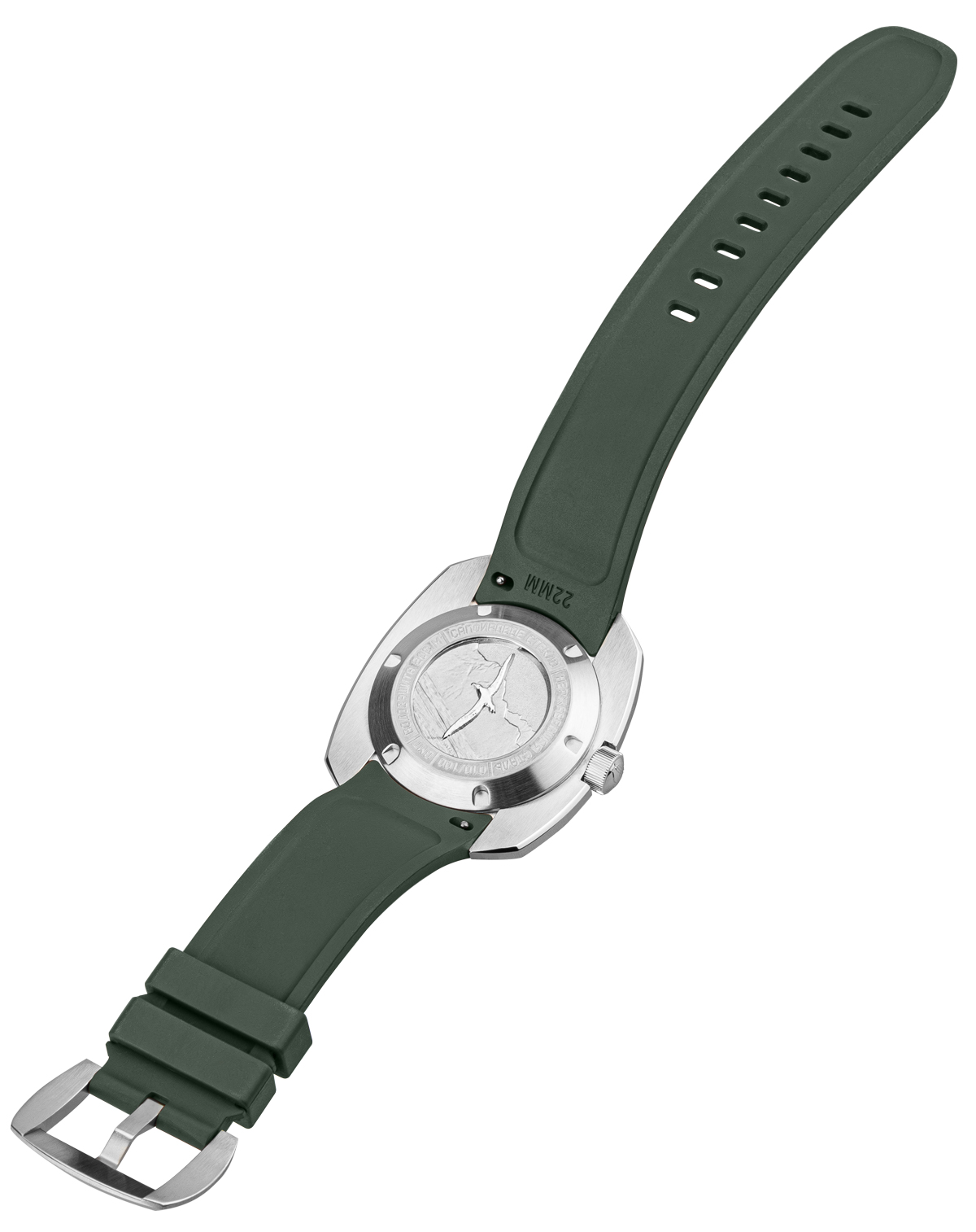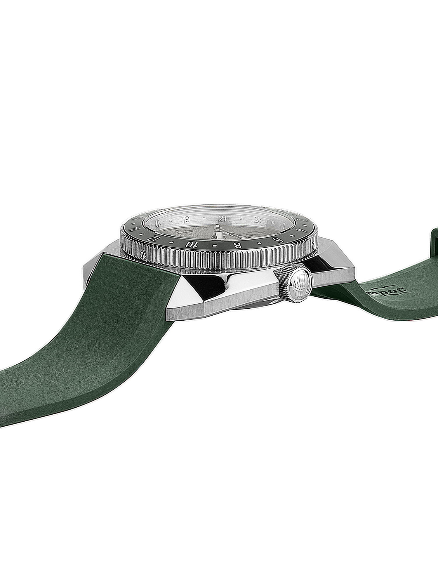 резиновый ремень интегрированный надежно в корпус с оригинальной пряжкой (дизайн перекликается с корпусом) и логотипом – прочный, для дайверского костюма и воды.