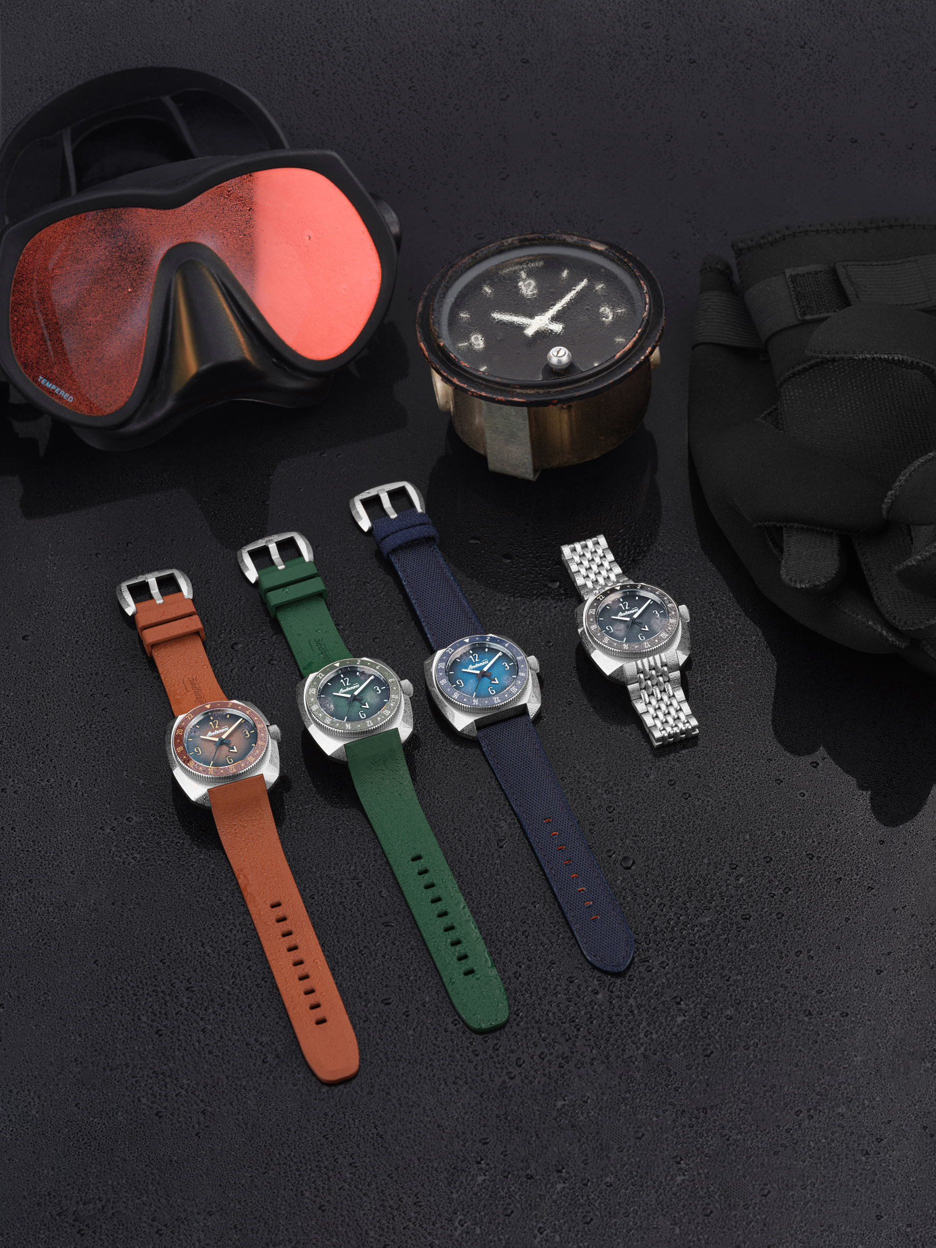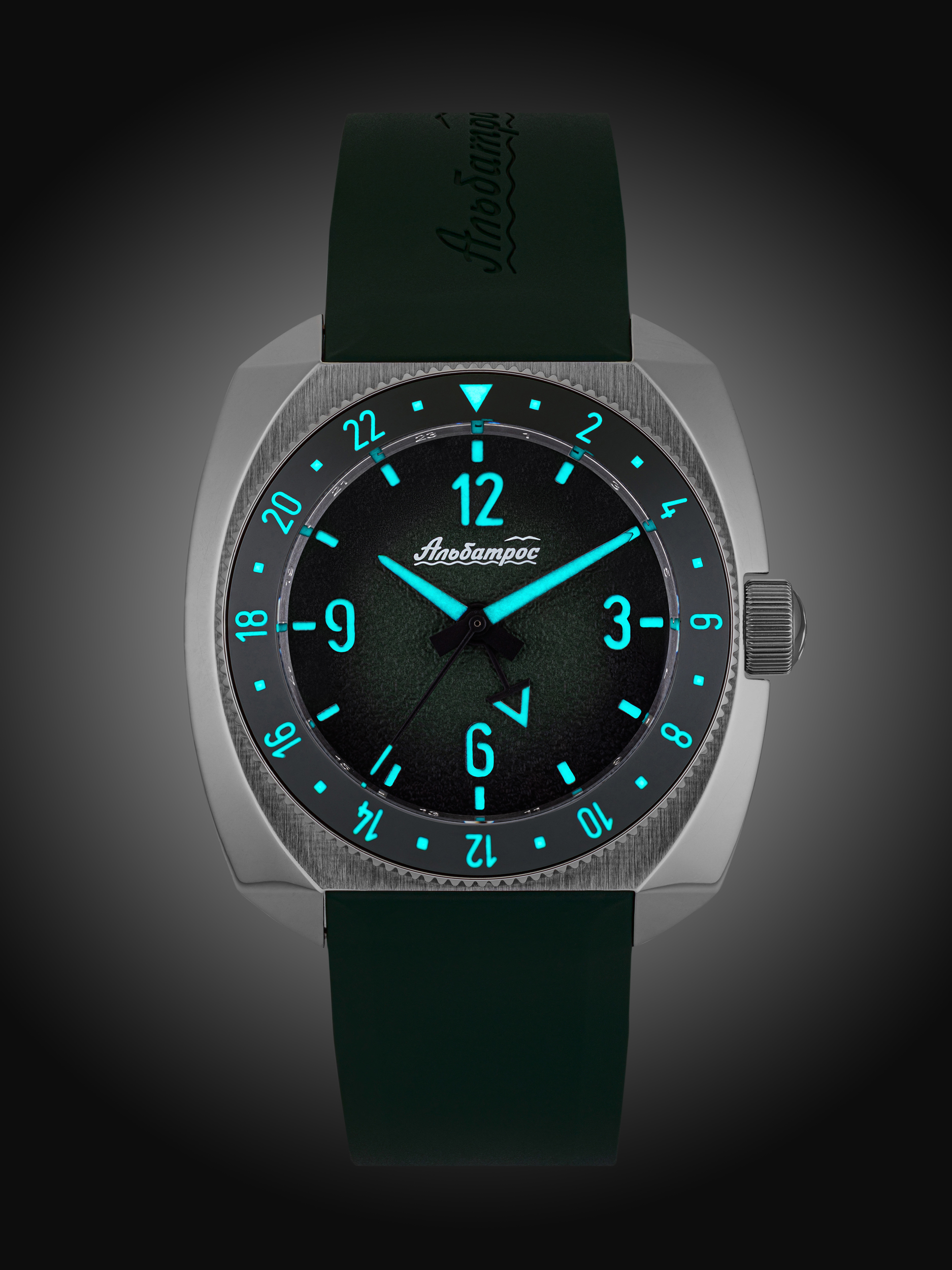 Троллейбусные часы завода , разработанные в советское время специально для транспорта. Эти приборы создавались под жёсткие требования: моментальная читаемость для водителя в любых условиях освещения, экстремальная контрастность стрелок и меток, отсутствие отвлекающих элементов. Мы адаптировали эту концепцию для дайверских часов: сэндвич-циферблат песочной фактурой для минимизации бликов, с градиентным переходом в четырёх вариантах (чёрный, коричневый, синий, зелёный). Люминесцентные стрелки и метки светятся ярко, противовесы (хвосты) - в тёмной краске для баланса, GMT- и секундная стрелки — чёткие, без перегрузки. Результат — отличная читаемость под водой или ночью, как в троллейбусной кабине 70-х.